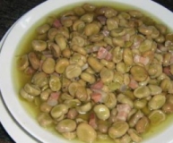 1. En una sartén se pone a calentar el aceite, se añaden las habas tiernas desgranadas, la cebolla picada y el jamón a tacos, se tapa y se deja a fuego lento hasta que estén tiernas, se rectifica de sal.