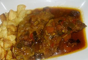 - En una cazuela se colocan los pies de cerdo, este sofrito, el vino y dos o tres cucharones del caldo de hervir los pies por encima.